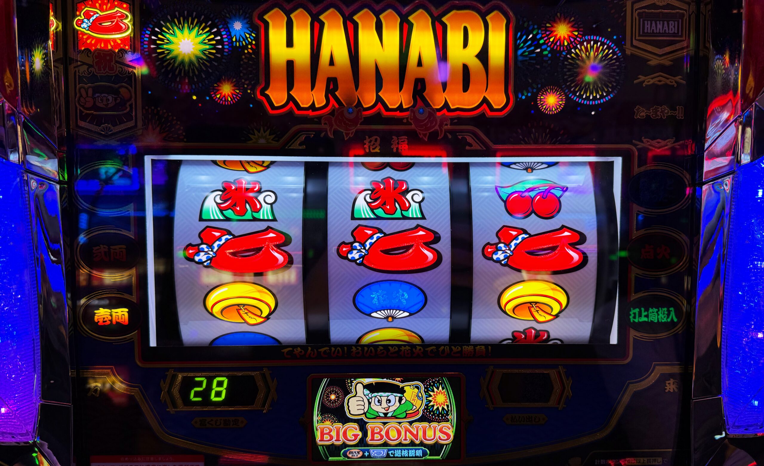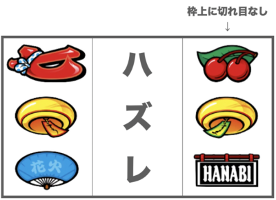 左リールBAR中段or下段狙いをしている場合、中段に赤七が停止(3〜4コマスベリ)で小役ハズレ目となります。